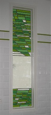 Ce vitrail, réalisé selon la maquette qu'il a établie, se marie avec le décor de la salle de bains où il est installé.